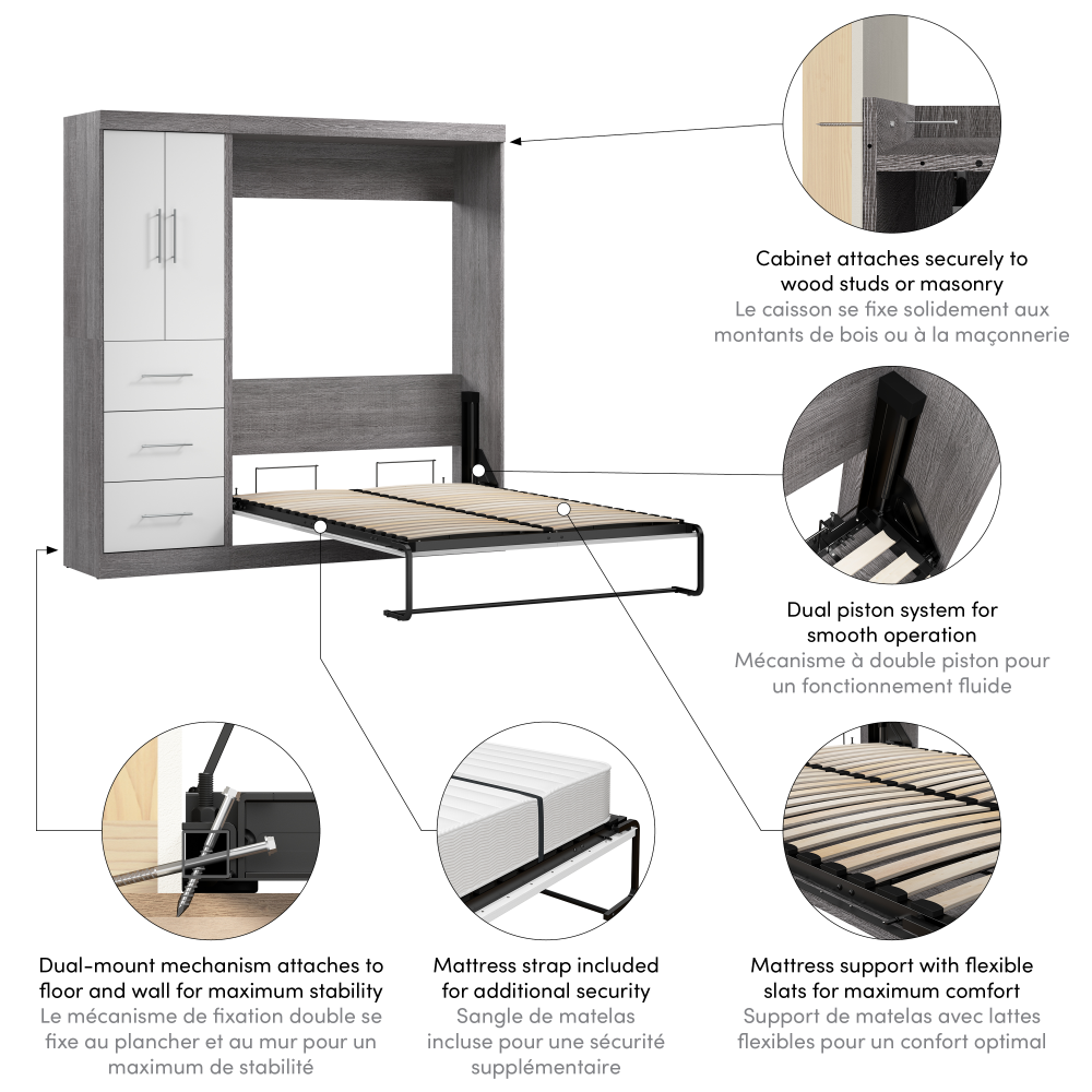 - Le mécanisme de fixation double du lit escamotable se fixe au plancher et au mur pour faciliter l’assemblage et pour un maximum de stabilité et de durabilité