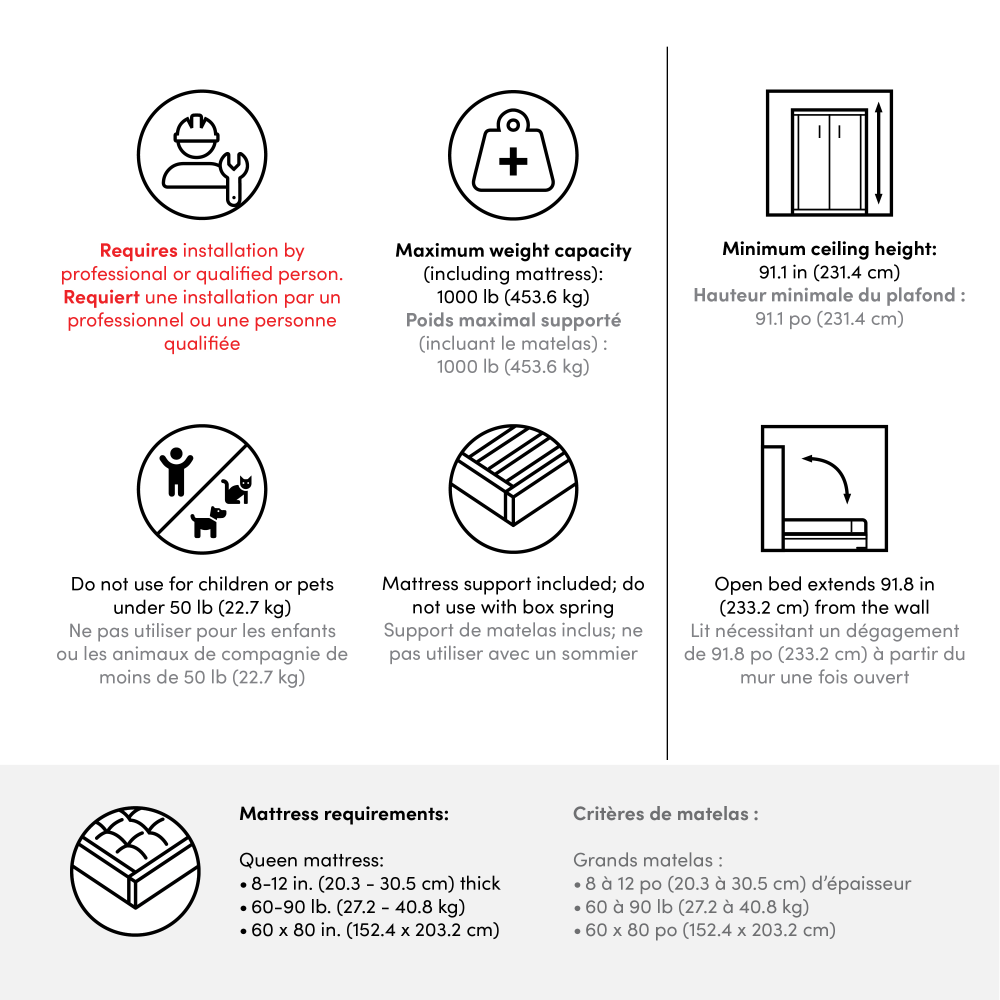 L’installation d’un lit escamotable nécessite des compétences avancées et la capacité de localiser et de fixer l’unité aux montants muraux. L’installation implique la fixation aux structures murales et au sol (montants en bois ou maçonnerie), le retrait de la plinthe et le perçage du sol. Puisque le meuble doit être installé de manière sécuritaire et précise, nous recommandons fortement de faire appel à un installateur ou à un entrepreneur professionnel afin d’assurer votre sécurité et la longévité du produit. -