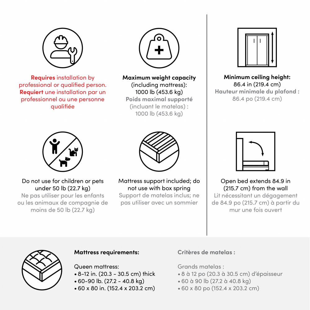 - Wall bed accommodates most standard Queen mattresses (8–12 inches thick, 60–90 lb, 60 x 80 inches, no futons) to let you choose the most comfortable option (mattress not included, do not use with box spring)
