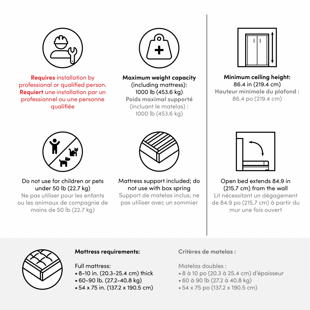 L’installation d’un lit escamotable nécessite des compétences avancées et la capacité de localiser et de fixer l’unité aux montants muraux. L’installation implique la fixation aux structures murales et au sol (montants en bois ou maçonnerie), le retrait de la plinthe et le perçage du sol. Puisque le meuble doit être installé de manière sécuritaire et précise, nous recommandons fortement de faire appel à un installateur ou à un entrepreneur professionnel afin d’assurer votre sécurité et la longévité du produit. -