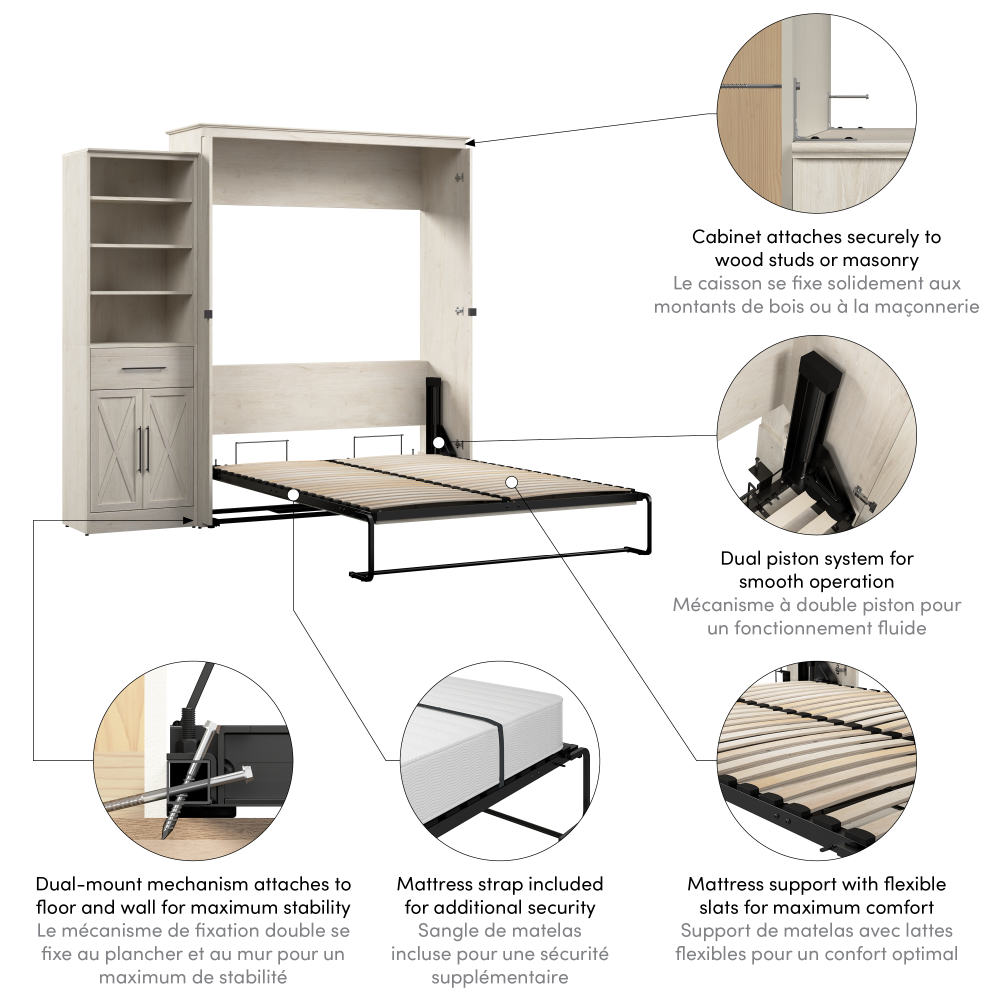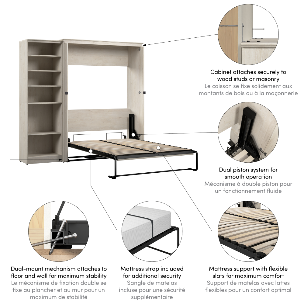 - Dual-mount wall bed mechanism attaches to floor and wall for ease of assembly and maximum stability and durability