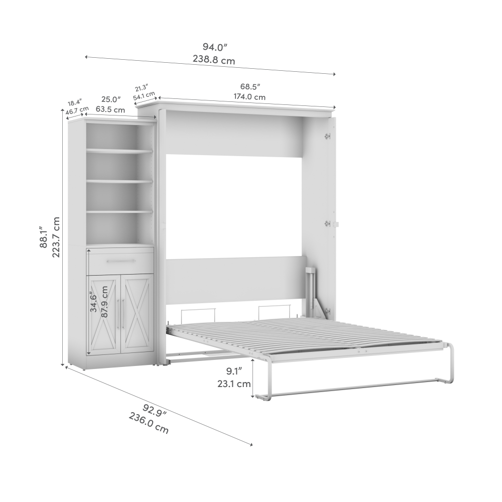 - Durable steel wall bed frame and laminated engineered wood cabinet with leg levelers; minimum ceiling height is 87 inches, and open bed extends 88.2 inches from the wall