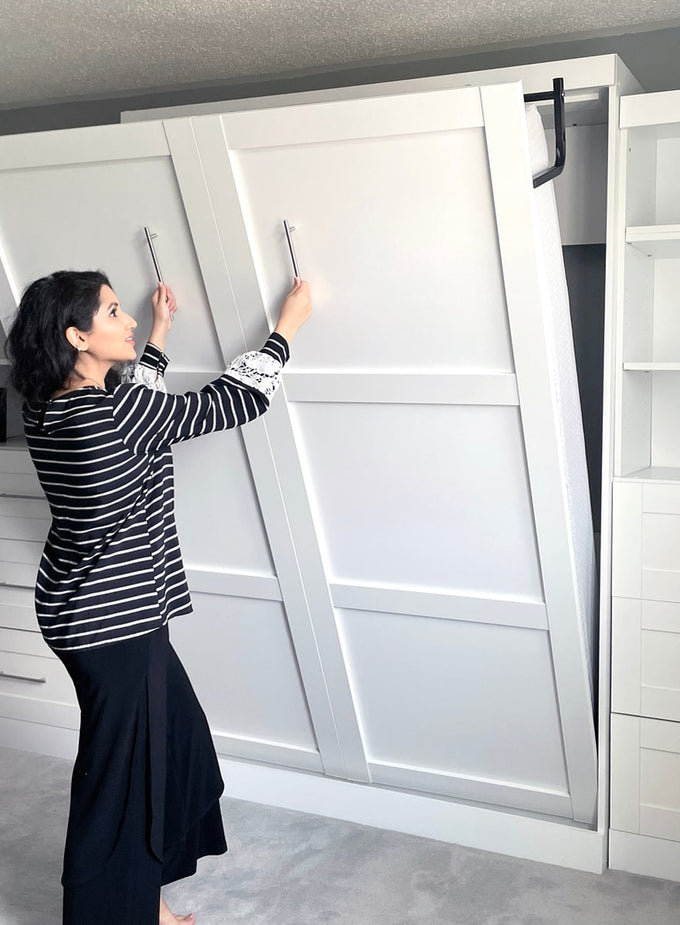 Installing a Murphy Bed requires advanced skills and the ability to locate and anchor the unit to wall studs. Installation involves attachment to wall and floor structures (wood studs or masonry), removal of the baseboard, and drilling into the floor. Because the unit must be safely and accurately installed, we strongly recommend hiring a professional installer or contractor. This ensures both your safety and the product's longevity. -